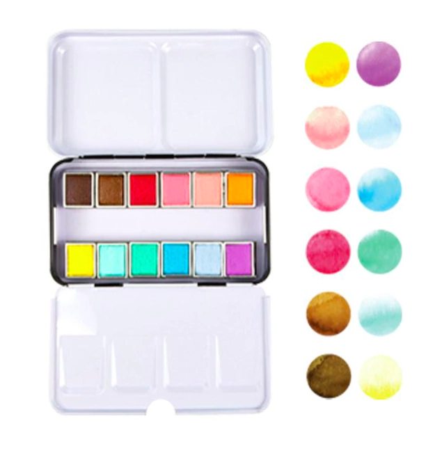 Posee 12 medias pastillas o godets con espacio en la tapa para mezclar y trabajar cómodamente.