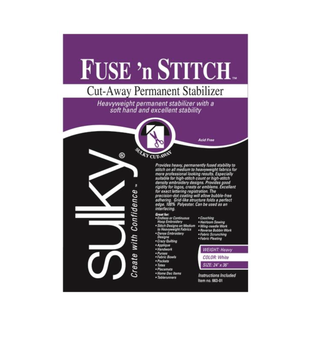 Estabilizador permanente SULKY-Fuse 'n Stitch Cut Away. Se trata de un estabilizador recortable, permanente y pesado con tacto suave y excelente estabilidad. Es ideal para diseños de puntadas de bordado de aro interminables o continuos en telas de peso medio a pesado, apliques, carteras, bolsillos, totes, decoración del hogar, telas para sofás, plisados y mucho más. Este estabilizador es especialmente adecuado para diseños de bordado con un alto número de puntadas o una alta densidad de puntadas. Proporciona buena rigidez para logotipos, escudos y emblemas, además de ser excelente para el registro exacto de letras. El revestimiento de puntos de precisión permitirá una adherencia sin burbujas y la estructura en forma de rejilla pliega un borde perfecto. Este paquete contiene una pieza de estabilizador 100% poliéster sin ácido de 24 x 36 pulgadas. Importado.