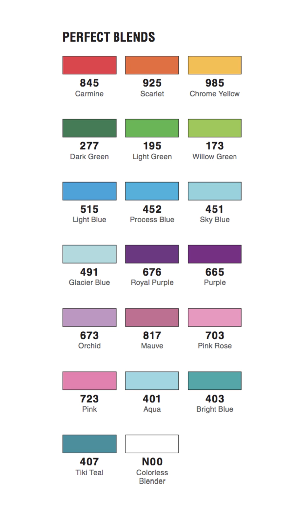 Este paquete contiene 20 marcadores en la combinación de colores: 845 - 925 - 985 - 277 - 195 - 173 - 515 - 452 - 451 - 491 - 676 - 665 - 673 - 817 - 703 - 723 - 407 - 403 - 401 - N00