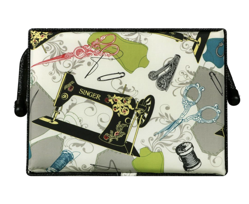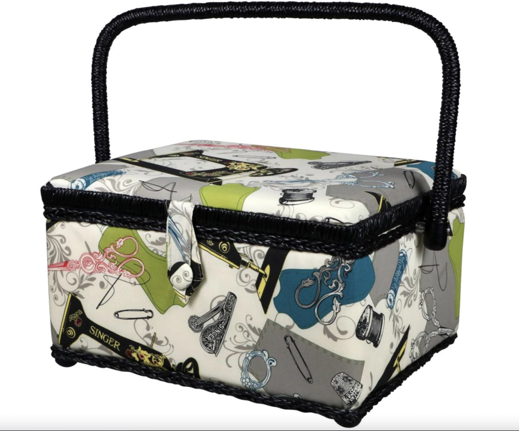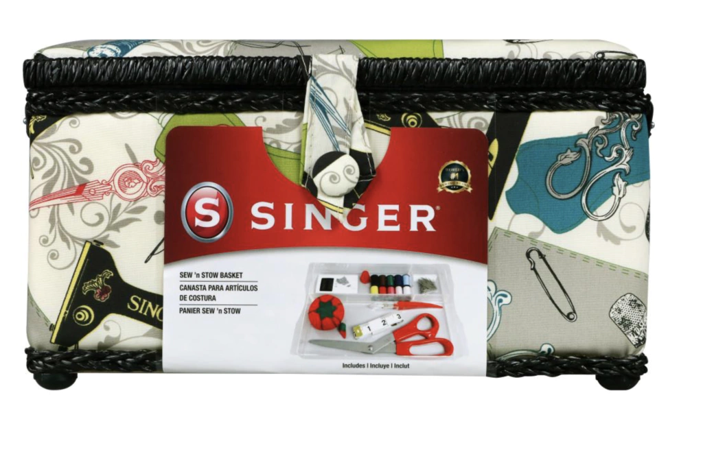 La cesta de costura SINGER con estampado vintage y accesorios para el kit de costura es el regalo perfecto para principiantes o una nueva adición a su colección. Con una amplia bandeja de almacenamiento y organización, el estuche ofrece un cierre seguro y un asa abatible que facilita su transporte y almacenamiento. El paquete básico incluye: 10 agujas de mano surtidas, 100 alfileres de costura (tamaño 17, 2,7 cm), tijeras de tela de 20 cm, 10 minicarretes de hilo (9,2 m cada uno), enhebrador, alfiletero, descosedor, cinta métrica de 152 cm y dedal. La cesta mide 20 x 26 x 14 cm.