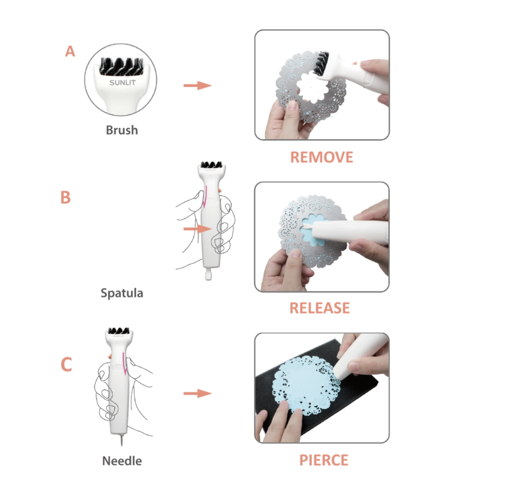 Modo de empleo: Ayúdate de la espátula para retirar la pieza final troquelada sin que se dañe o doble.