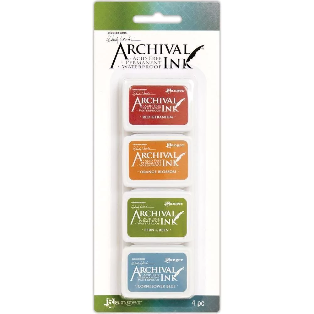 Las tintas Archival Ink están basadas en “colorantes”, no en pigmentos, por lo que son translúcidas, lo que significa que si se aplican sobre una superficie de color oscuro no se verá el efecto. Dejan un acabado bastante detallado cuando se usan para estampar sellos, y están disponibles en 24 colores.
